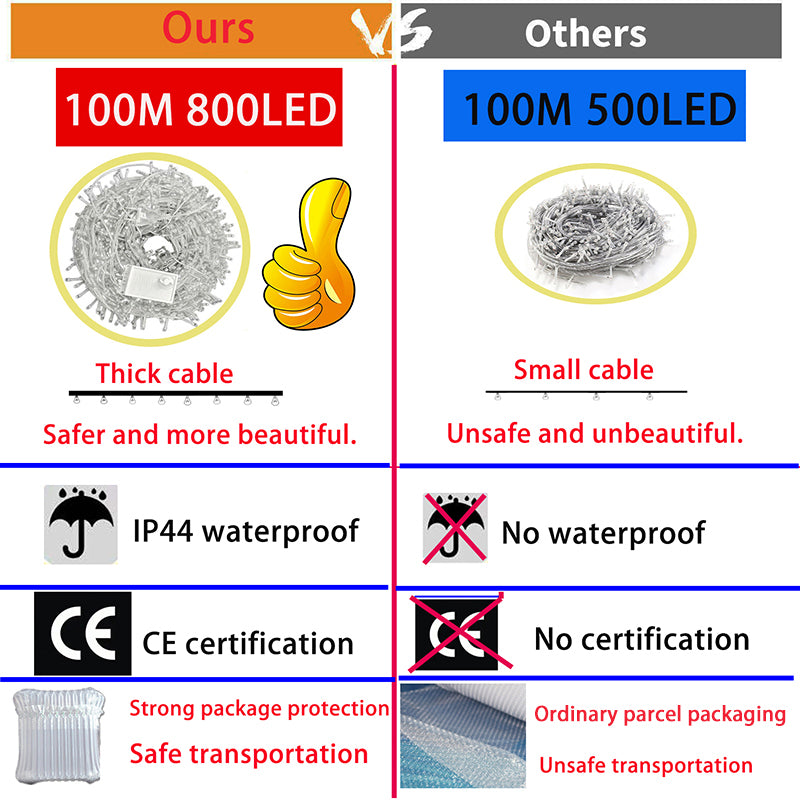 Specifications:Item Name: LED String LightColor: Warm White / Cold white / MulticolorLED quantity:100LED/200LED/300 LED/400LED/800LEDLED length:10M/20M/30M/50M/100MLead wire length: About 1 m